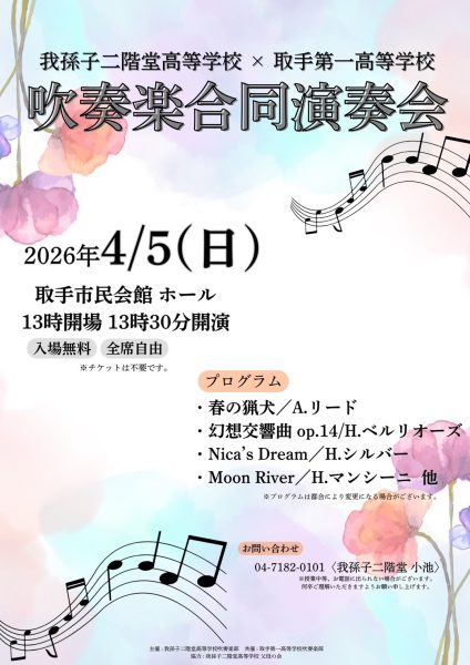 2026年4月5日(日)に茨城県立取手第一高等学校 吹奏楽部との合同演奏会を開催いたします。前回の演奏会に引き続き、夏のコンクールもご一緒させていただいた取手第一高等学校吹奏楽の皆様とともに、日々の練習の成果を多くの皆様に披露させていただきます。